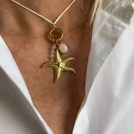 Charm Kette mit Satinband - Seestern, Süsswasserperle und Rosenquarz Anhänger