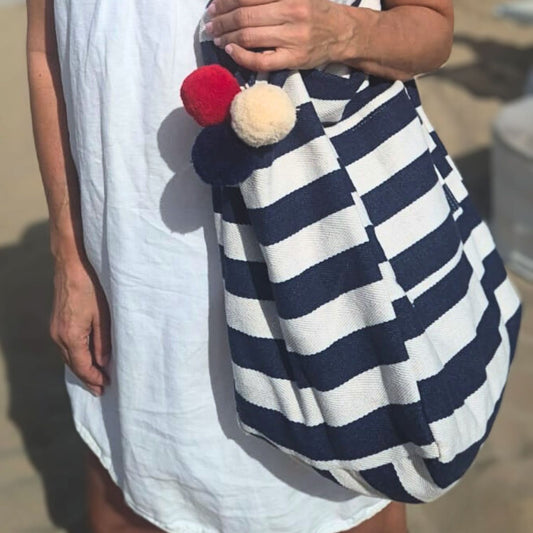 Badetasche XXL - blau-weiss gestreift mit Pompom