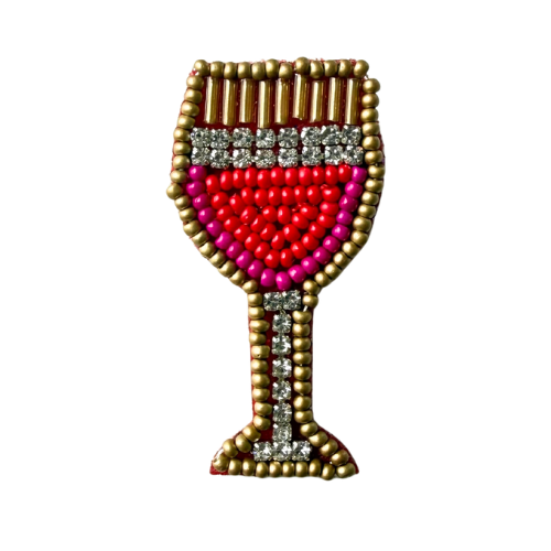 Diese elegante Brosche in Form eines Weinglases ist ein funkelndes Highlight für Deinen Look. Mit schimmernden Pailletten und feinen Perlen aufwendig handbestickt, strahlt sie Leichtigkeit, Stil und einen Hauch von Genuss aus.