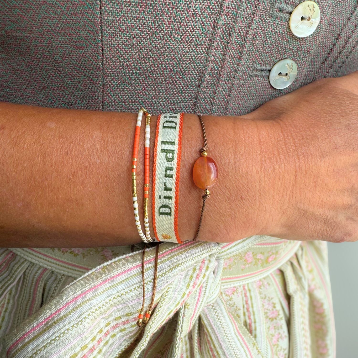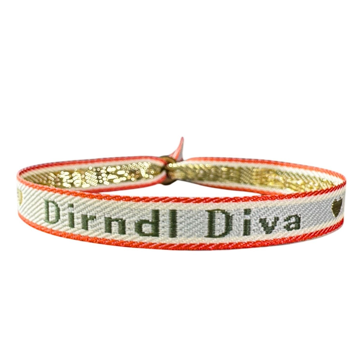 Gefertigt aus einem hochwertigen, weichen Textilband in beige, grün und orange, passt sich das Armband durch eine praktische Schiebeperle individuell Deinem Handgelenk an. Das Statement „Dirndl Diva“ ist dezent, aber kraftvoll eingearbeitet und macht Dein Outfit zum Blickfang.